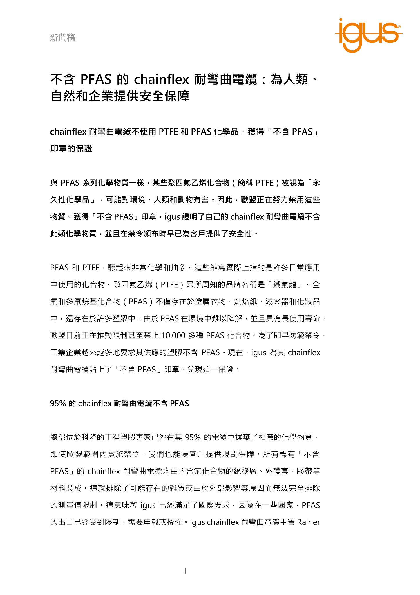 與 PFAS 系列化學物質一樣,某些聚四氟乙烯化合物(簡稱 PTFE)被視為「永久性化學品」,可能對環境、人類和動物有害。因此,歐盟正在努力禁用這些物質。獲得「不含 PFAS」印章,igus 證明了自己的 chainflex 耐彎曲電纜不含此類化學物質,並且在禁令頒布時早已為客戶提供了安全性。