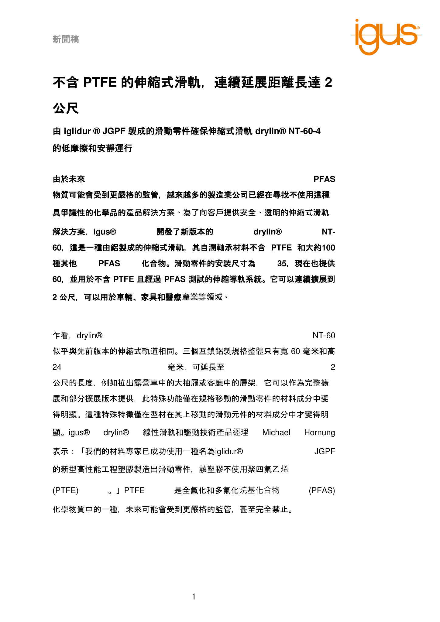 Michael Hornung 說:「由 iglidur® JGPF 製成的滑動零件在 drylin® NT-60-4 中給人留下了深刻的印象,無需額外的潤滑劑即可實現平穩、乾式運行。與帶有滾珠軸承的傳統伸縮裝置相比,igus® 伸縮式滑軌更加可靠,維護工作更少,也更衛生,現在也可以提供不含 PTFE 的產品。」新材料還針對約 100 種其他 PFAS 化合物進行了測試,公司認為這些化合物最有可能受到未來限制的影響。新的伸縮式軌道即裝即用滑軌規格有銀色或黑色陽極氧化可供選擇,igus® 提供扁平 (NTKA-60) 和高階端蓋 (NTKB-60) 作為邊緣保護,安裝尺寸 NT-35 和 NT-27 也提供不含 PTFE 的版本。