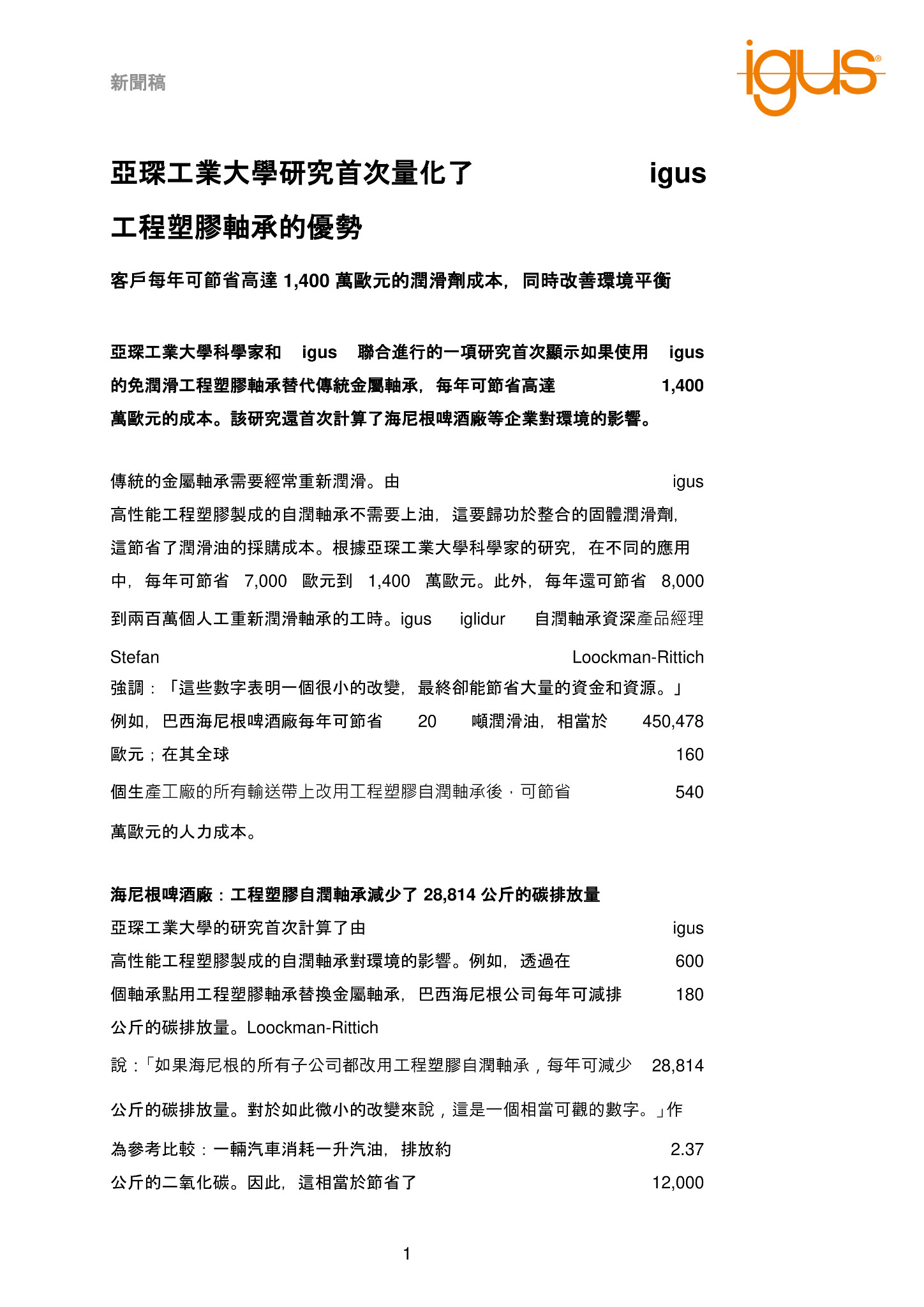 亞琛工業大學科學家和 igus 聯合進行的一項研究首次顯示如果使用 igus 的免潤滑工程塑膠軸承替代傳統金屬軸承,每年可節省高達 1,400 萬歐元的成本。該研究還首次計算了海尼根啤酒廠等企業對環境的影響。