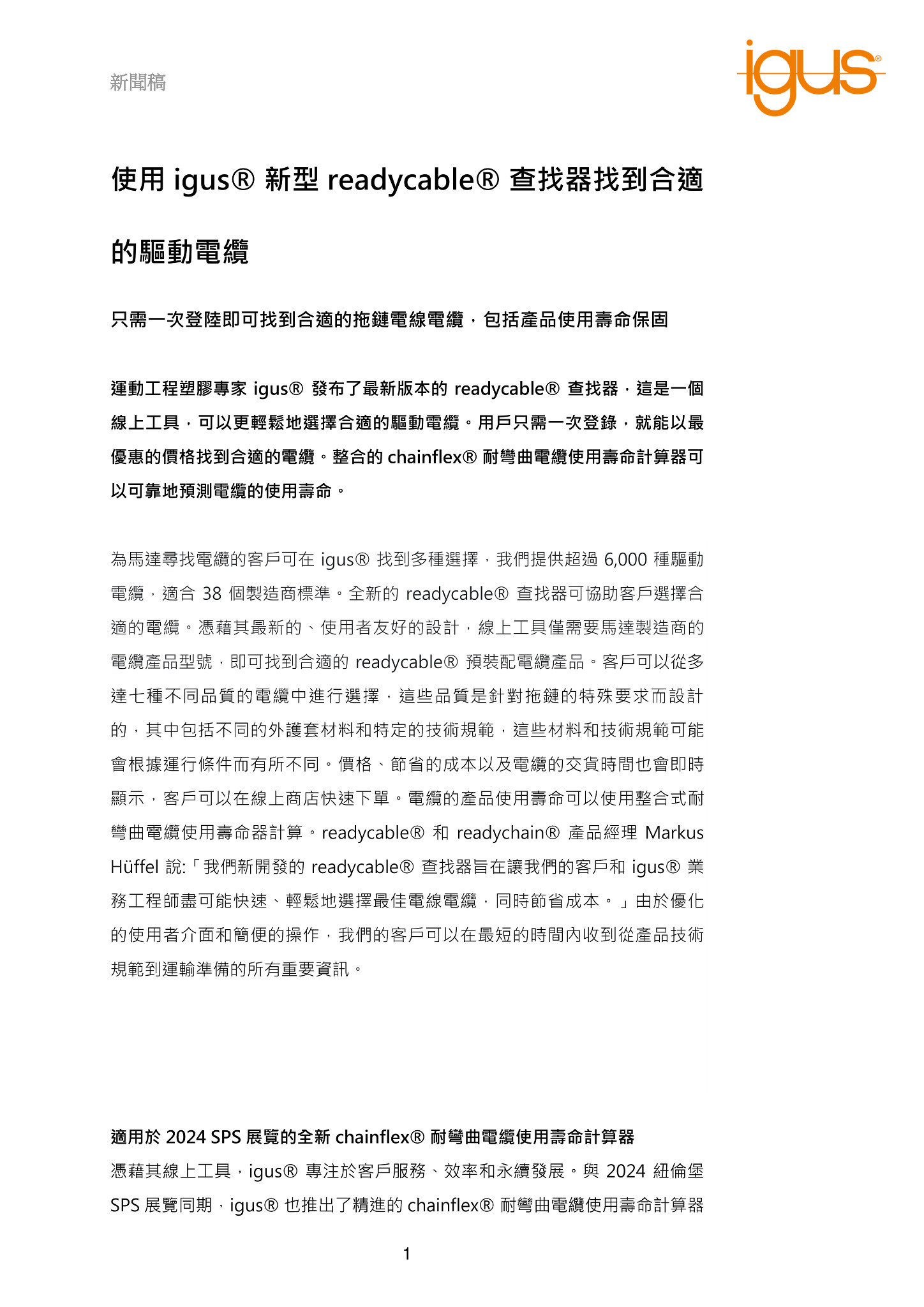 運動工程塑膠專家 igus® 發布了最新版本的 readycable® 查找器,這是一個線上工具,可以更輕鬆地選擇合適的驅動電纜。用戶只需一次登錄,就能以最優惠的價格找到合適的電纜。整合的 chainflex® 耐彎曲電纜使用壽命計算器可以可靠地預測電纜的使用壽命。