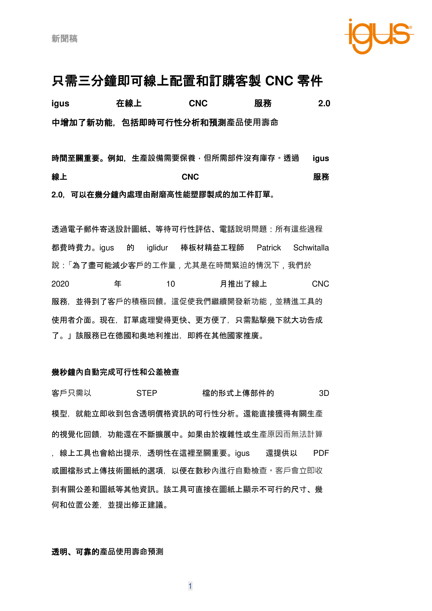有關 igus 線上 CNC 服務的更多資訊,請前往:CNC service I Fast I Simple I Transparent (igus.eu)