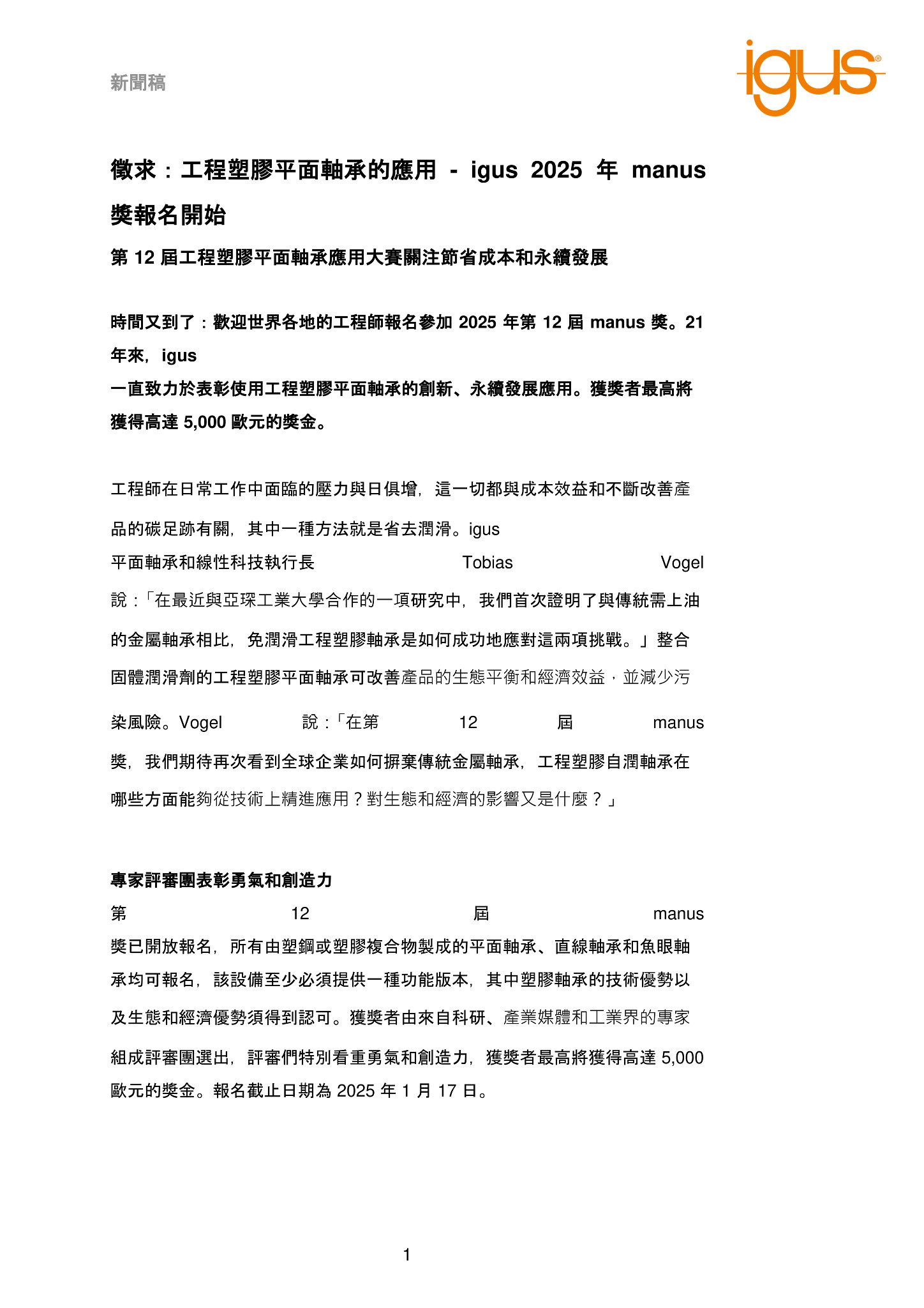 相關注意事項、報名表以及歷屆獲獎者的概況,請前往 www.igus.com.tw/manus。