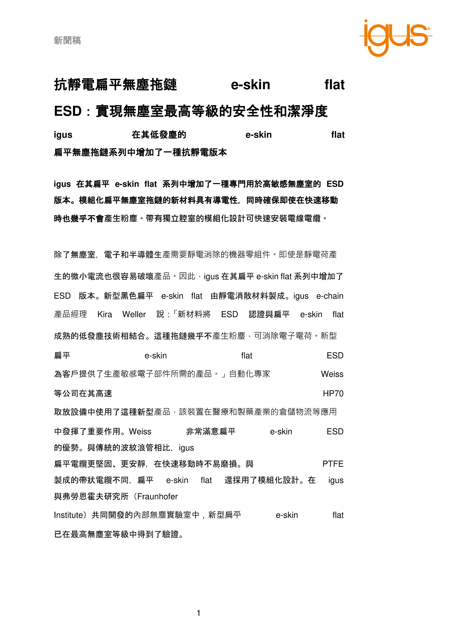 igus 在其低發塵的 e-skin flat 扁平無塵拖鏈系列中增加了一種抗靜電版本
