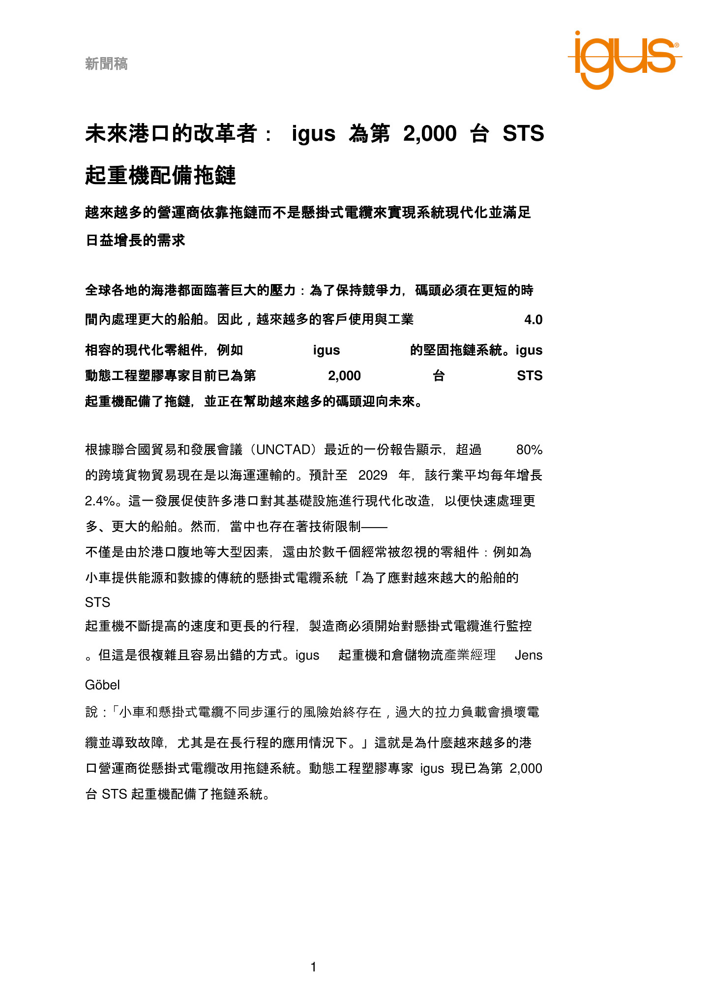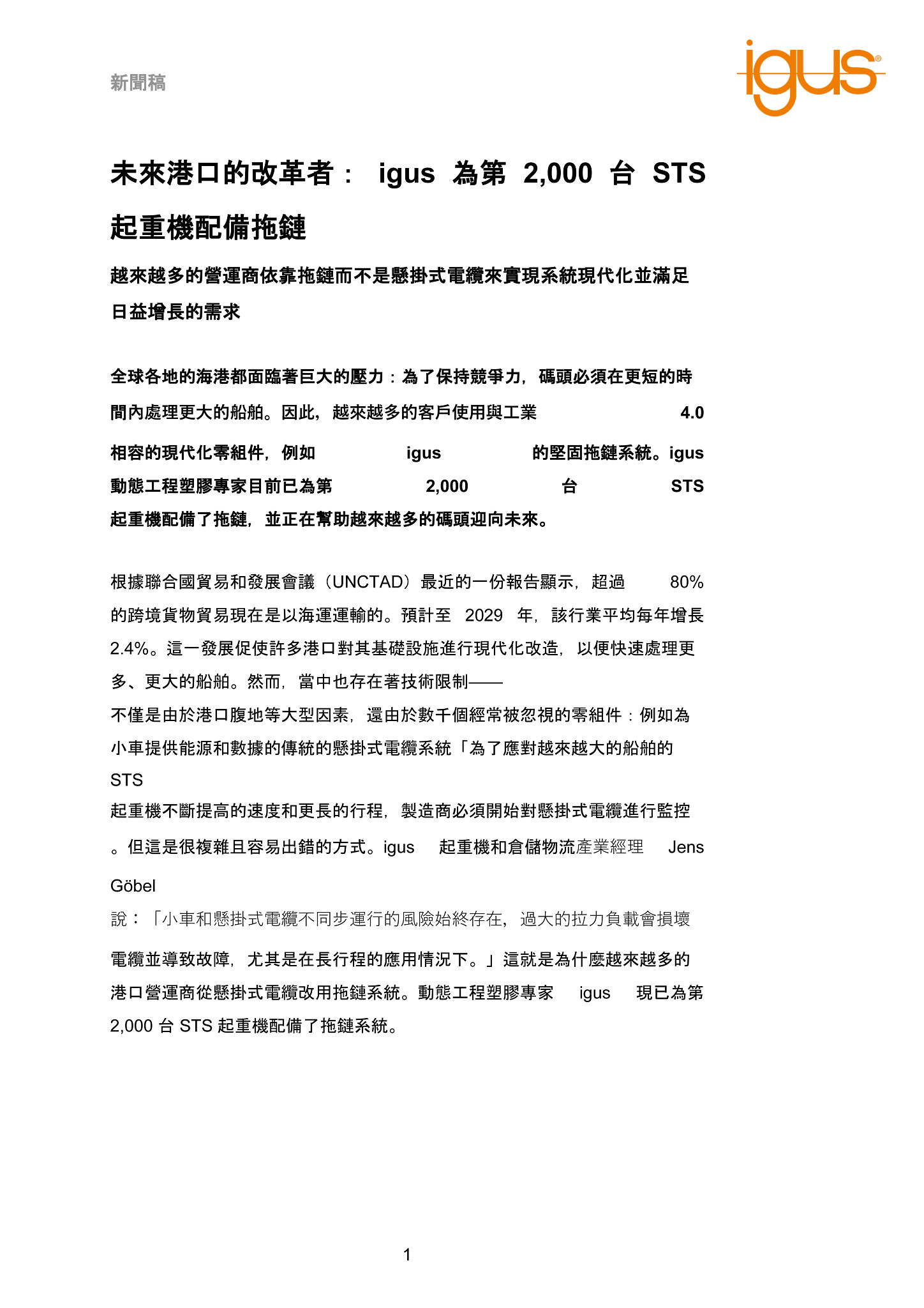 全球各地的海港都面臨著巨大的壓力:為了保持競爭力,碼頭必須在更短的時間內處理更大的船舶。因此,越來越多的客戶使用與工業 4.0 相容的現代化零組件,例如 igus 的堅固拖鏈系統。igus 動態工程塑膠專家目前已為第 2,000 台 STS 起重機配備了拖鏈,並正在幫助越來越多的碼頭迎向未來。
