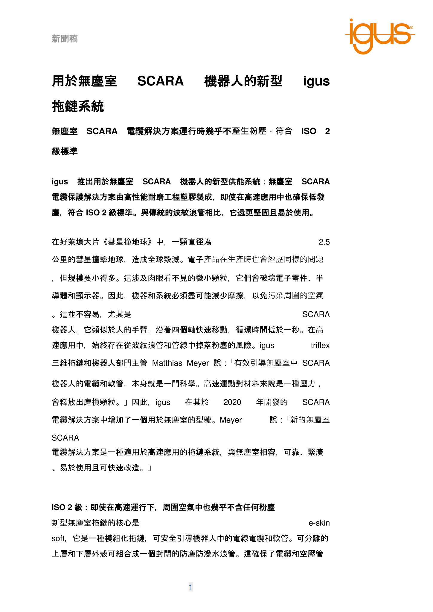 igus 推出用於無塵室 SCARA 機器人的新型供能系統:無塵室 SCARA 電纜保護解決方案由高性能耐磨工程塑膠製成,即使在高速應用中也確保低發塵,符合 ISO 2 級標準。與傳統的波紋浪管相比,它還更堅固且易於使用。