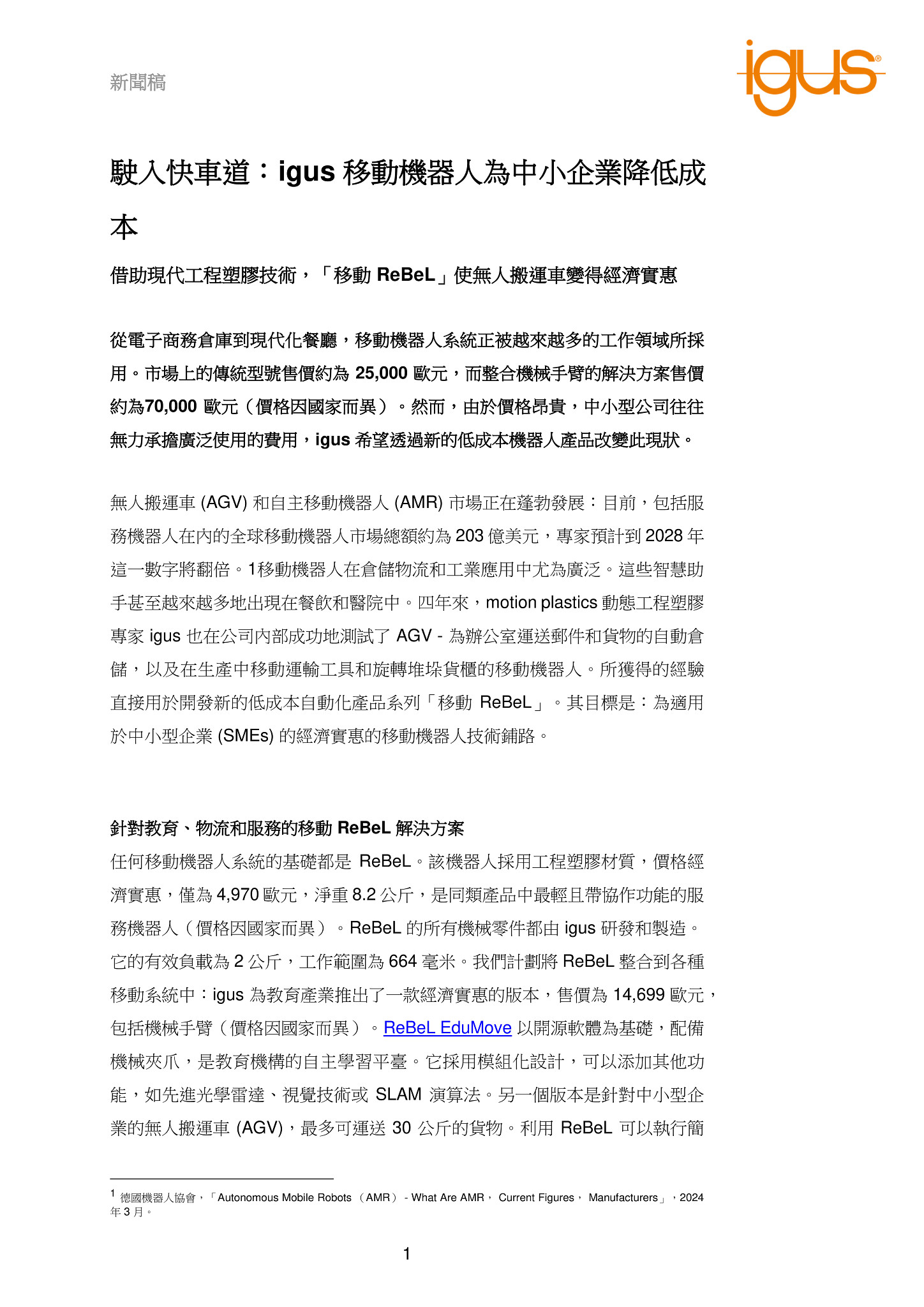 駛入快車道:igus 移動機器人為中小企業降低成本
