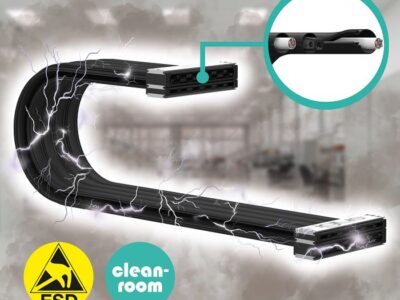 igus 在其扁平 e-skin flat 系列中增加了一種專門用於高敏感無塵室的 ESD 版本。模組化扁平無塵室拖鏈的新材料具有導電性,同時確保即使在快速移動時也幾乎不會產生粉塵。帶有獨立腔室的模組化設計可快速安裝電線電纜。
