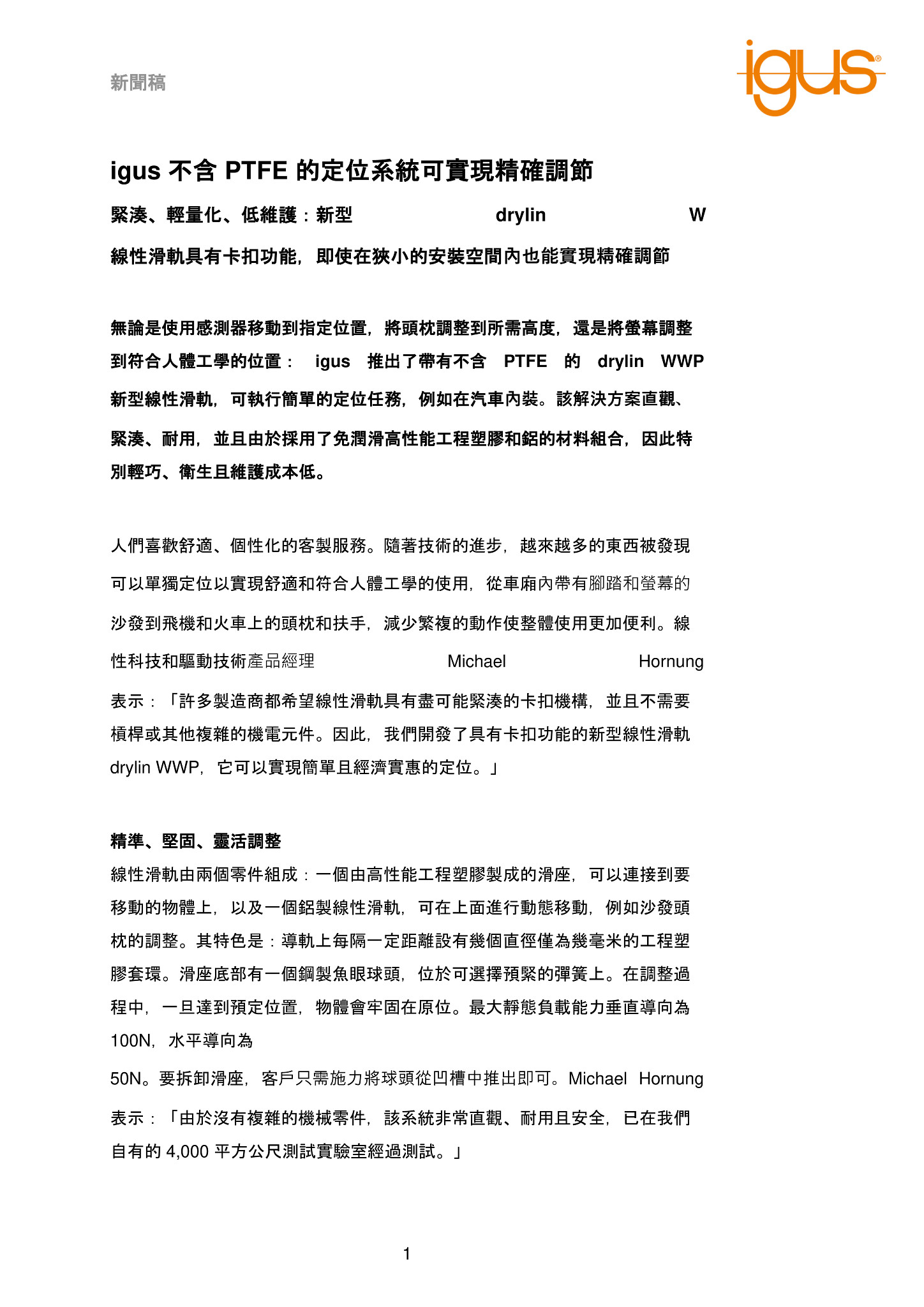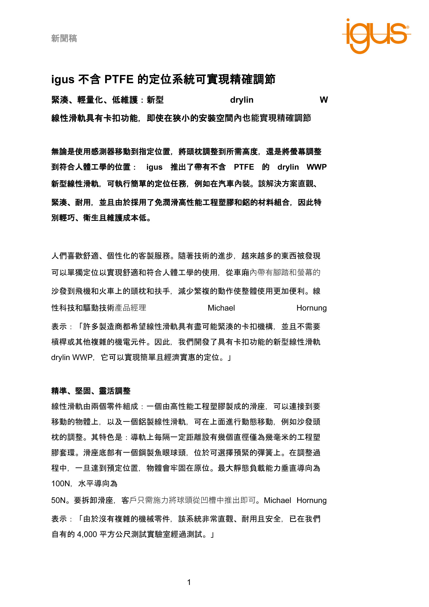 人們喜歡舒適、個性化的客製服務。隨著技術的進步,越來越多的東西被發現可以單獨定位以實現舒適和符合人體工學的使用,從車廂內帶有腳踏和螢幕的沙發到飛機和火車上的頭枕和扶手,減少繁複的動作使整體使用更加便利。線性科技和驅動技術產品經理 Michael Hornung 表示:「許多製造商都希望線性滑軌具有盡可能緊湊的卡扣機構,並且不需要槓桿或其他複雜的機電元件。因此,我們開發了具有卡扣功能的新型線性滑軌 drylin WWP,它可以實現簡單且經濟實惠的定位。」