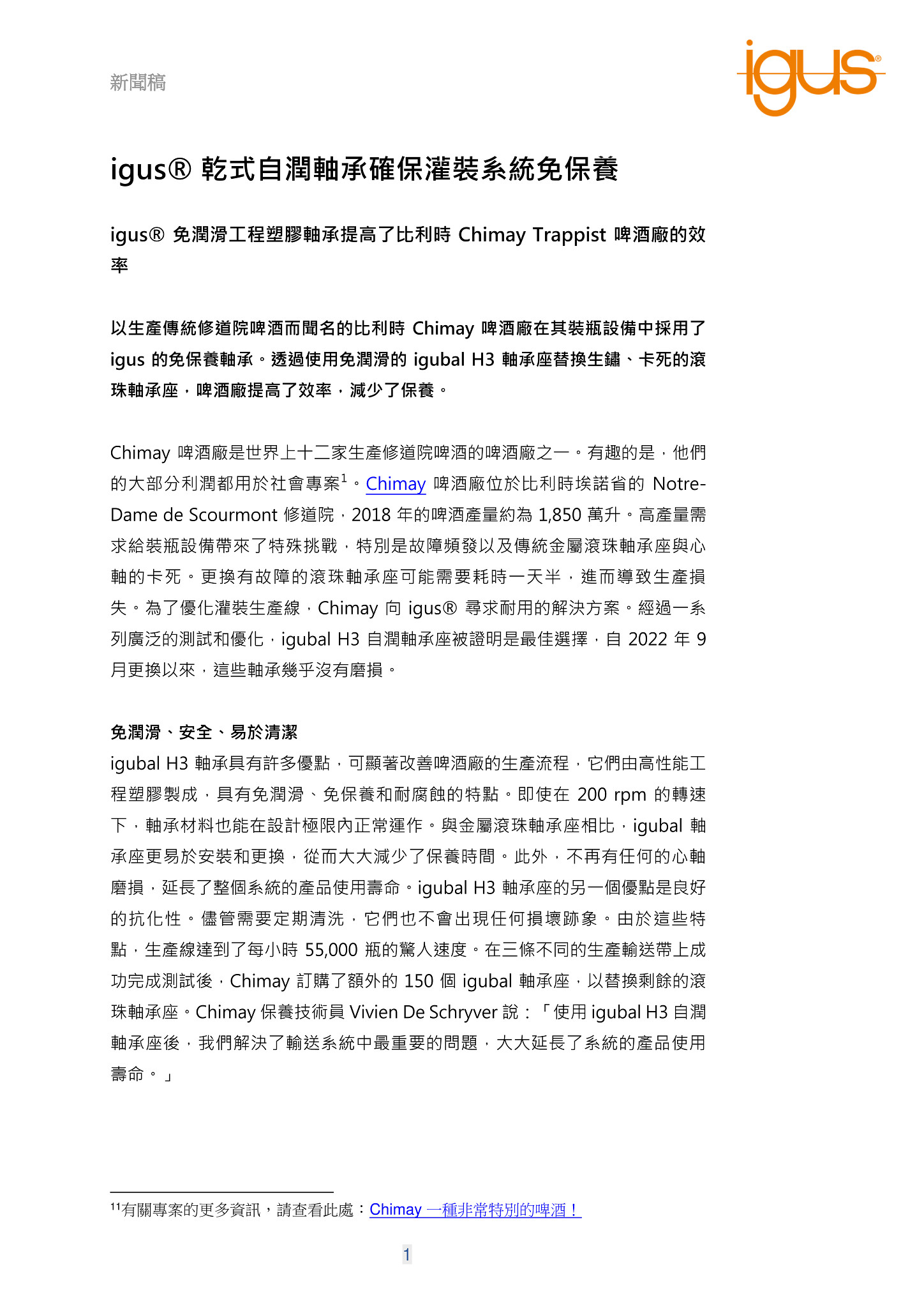 以生產傳統修道院啤酒而聞名的比利時 Chimay 啤酒廠在其裝瓶設備中採用了 igus 的免保養軸承。透過使用免潤滑的 igubal H3 軸承座替換生鏽、卡死的滾珠軸承座,啤酒廠提高了效率,減少了保養。