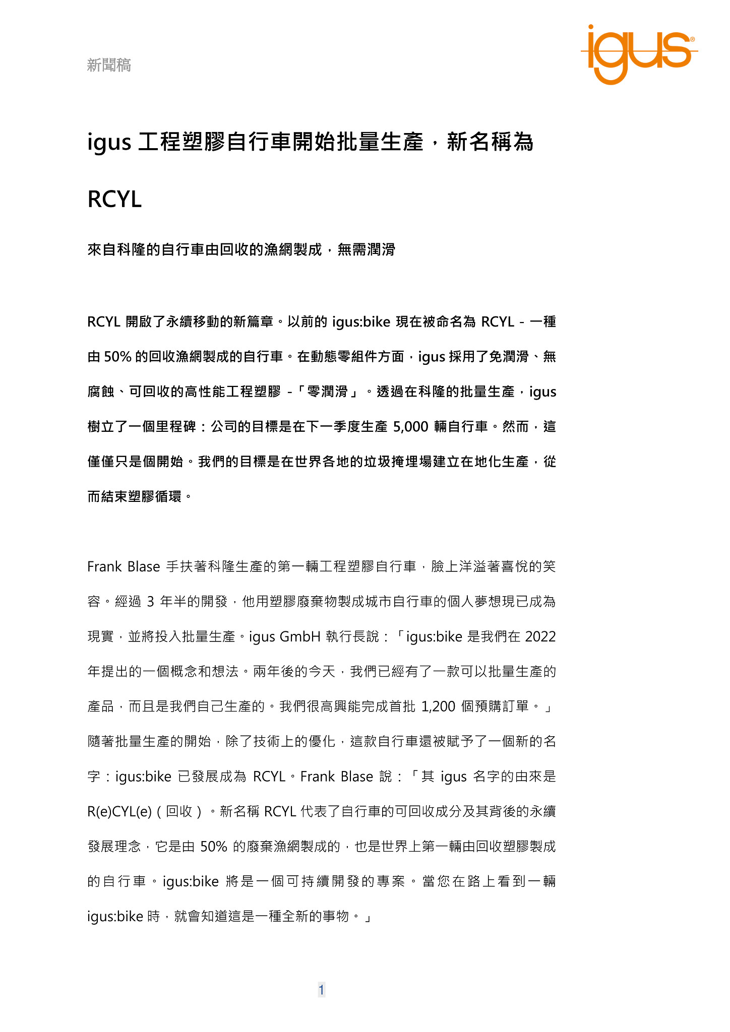 Frank Blase 手扶著科隆生產的第一輛工程塑膠自行車,臉上洋溢著喜悅的笑容。經過 3 年半的開發,他用塑膠廢棄物製成城市自行車的個人夢想現已成為現實,並將投入批量生產。igus GmbH 執行長說:「igus:bike 是我們在 2022 年提出的一個概念和想法。兩年後的今天,我們已經有了一款可以批量生產的產品,而且是我們自己生產的。我們很高興能完成首批 1,200 個預購訂單。」隨著批量生產的開始,除了技術上的優化,這款自行車還被賦予了一個新的名字:igus:bike 已發展成為 RCYL。Frank Blase 說:「其 igus 名字的由來是 R(e)CYL(e)(回收)。新名稱 RCYL 代表了自行車的可回收成分及其背後的永續發展理念,它是由 50% 的廢棄漁網製成的,也是世界上第一輛由回收塑膠製成的自行車。igus:bike 將是一個可持續開發的專案。當您在路上看到一輛 igus:bike 時,就會知道這是一種全新的事物。」