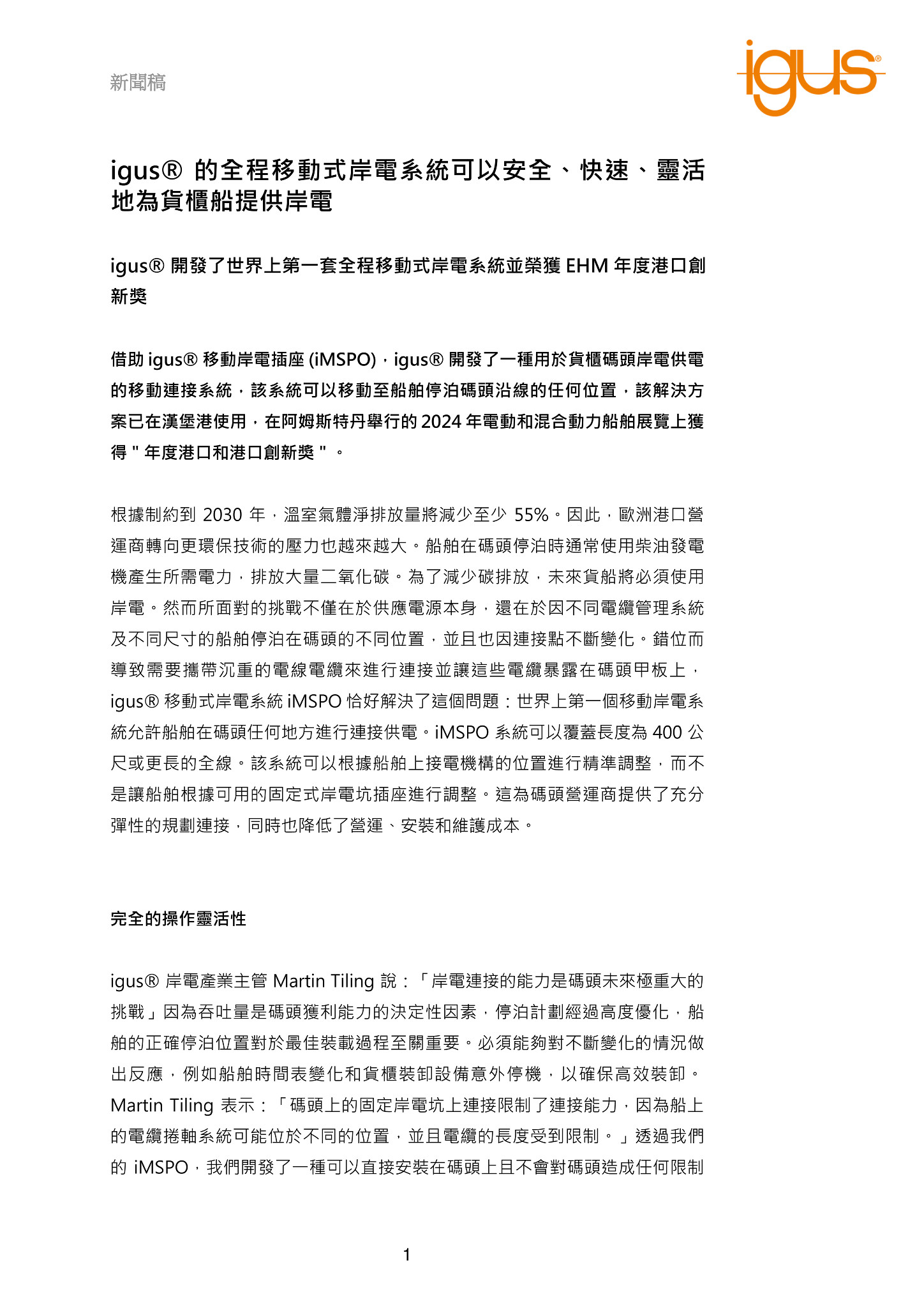借助 igus® 移動岸電插座 (iMSPO),igus® 開發了一種用於貨櫃碼頭岸電供電的移動連接系統,該系統可以移動至船舶停泊碼頭沿線的任何位置,該解決方案已在漢堡港使用,在阿姆斯特丹舉行的 2024 年電動和混合動力船舶展覽上獲得 ” 年度港口和港口創新獎 ” 。