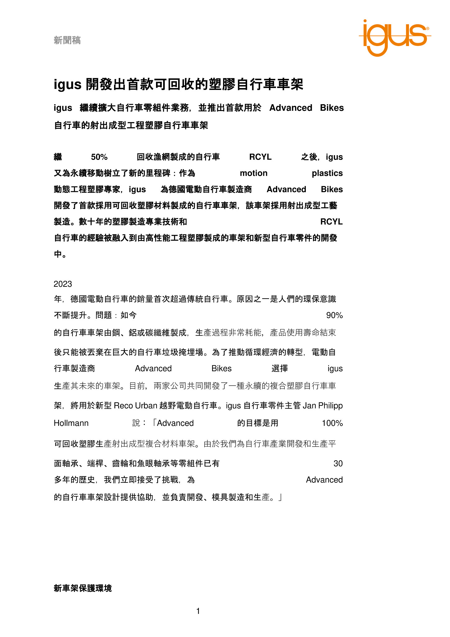 為確保車架具有足夠的強度、剛度和輕量化,igus 使用了一種由高性能工程塑膠和碳纖維組成的複合材料。此外,igus 還在數周內針對自行車車架的複雜幾何形狀製作了一個多部件射出成型模具。其結果是:3.3 公斤的輕量化一體式射出成型自行車車架 – 無焊縫、耐腐蝕、經久耐用,並經過外部測試。車架在德國生產,還能縮短物流距離,並根據需求及時生產。igus 能夠透過自己的「chainge」拖鏈回收計畫對報廢車架進行回收,以便重新使用材料。Advanced 的創始人 Helge von Fugler 解釋:「今後,我們還希望採用射出成型工藝生產其他可回收的自行車部件,如後托架、輪圈、車把和座管,這是實現完全可回收電動自行車的唯一途徑。」