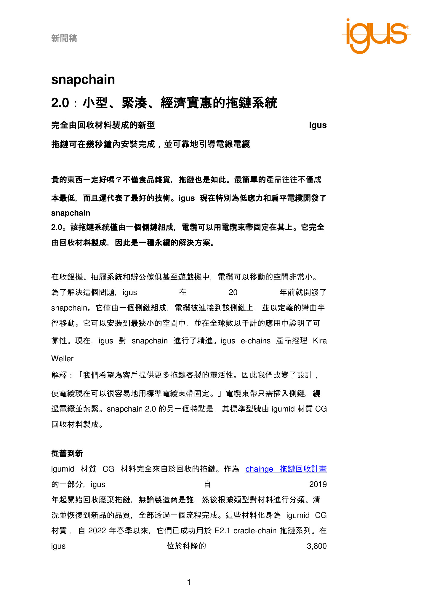 igumid 材質 CG 材料完全來自於回收的拖鏈。作為 chainge 拖鏈回收計畫的一部分,igus 自 2019 年起開始回收廢棄拖鏈,無論製造商是誰,然後根據類型對材料進行分類、清洗並恢復到新品的品質,全部透過一個流程完成。這些材料化身為 igumid CG 材質 ,自 2022 年春季以來,它們已成功用於 E2.1 cradle-chain 拖鏈系列。在 igus 位於科隆的 3,800 平方公尺的內部實驗室中,許多測試系列已經證實了其拉力和斷裂力。由回收材料製成的 e-chains 為資源保護做出了寶貴貢獻,並促進了循環經濟。根據環境產品宣言,這種可持續的原材料循環還將二氧化碳排放量減少了 28%。Weller 說:「snapchain 2.0 是一個經濟實惠的全能組合。它為客戶提供了一個可靠、可持續和快速裝配的產品。它是由回收材料製成的第二個拖鏈系列。在其使用壽命結束時,它也可以完全被回收利用。」